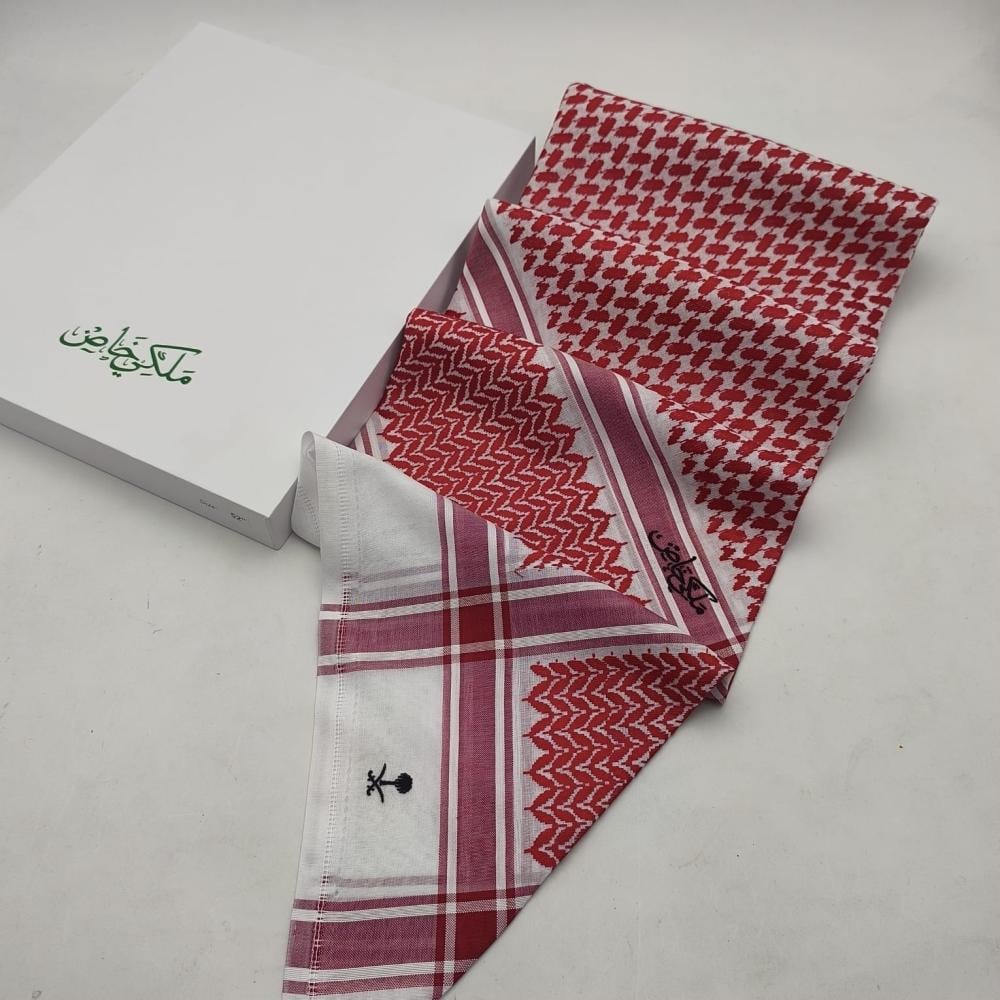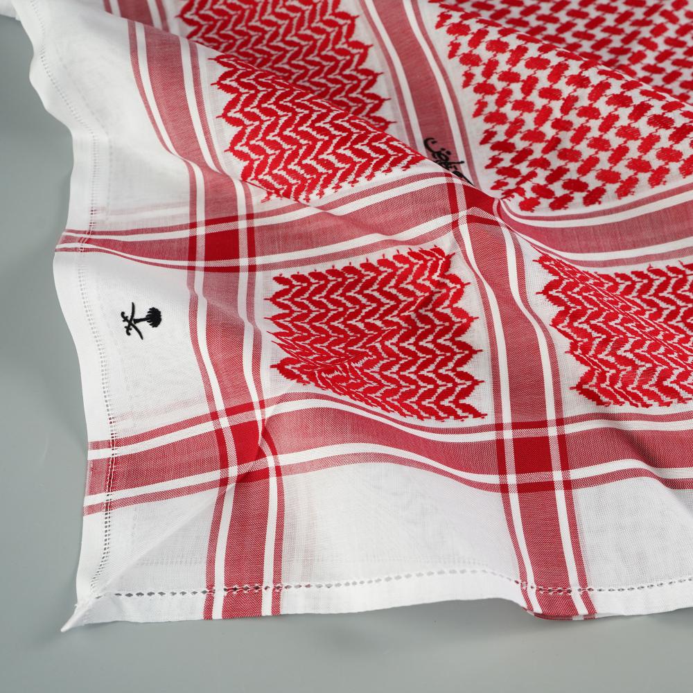 - شماغ ملكي خاص مزين بتطريز أنيق جداً بنفس اللون الأبيض، مما يضيف لمسة من الرقي والفخامة.
